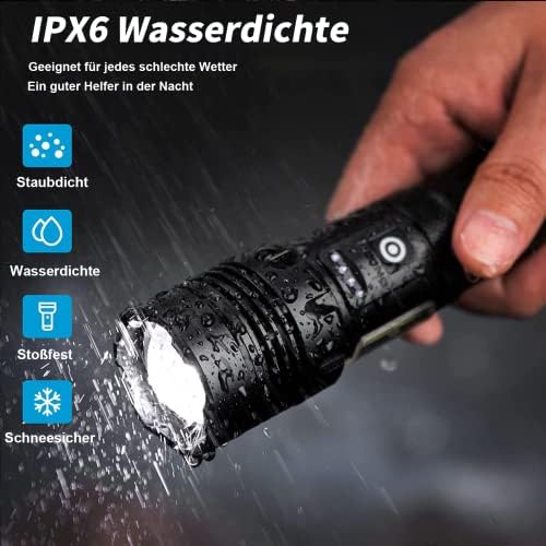 Im Lieferumfang enthalten sind: 1 x LED-Taschenlampe mit 500.000 Lumen, 1 x USB-C Ladekabel, 1 x 5000 mAh Lithiumbatterie, 1 x Benutzerhandbuch, 1 x Trageband und 1 x Halterung. Diese Taschenlampe eignet sich hervorragend für Outdoor-Aktivitäten, Camping, Angeln und Notfälle. Sie ist auch ein großartiges Weihnachtsgeschenk und das perfekte Geschenk für Männer.