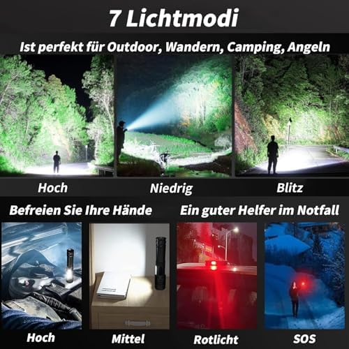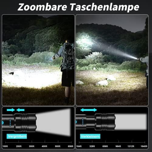 Die LED-Taschenlampe überzeugt mit einem beeindruckenden Lichtstrom von 500.000 Lumen, der selbst große Flächen wie Felder oder Gärten mühelos erhellt. Mit einer Reichweite von über 500 Metern ist sie Ihr idealer Begleiter für nächtliche Aktivitäten im Freien.