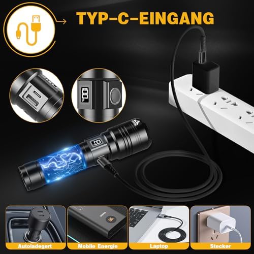 Unsere LED Taschenlampe ist mit einem leistungsstarken XHQ99 Chip ausgestattet, der eine Lichtleistung von bis zu 500.000 Lumen erreicht. Durch das hochwertige Design mit hoher Lichtdichte und Stabilität kann die Taschenlampe Staub und dichten Nebel durchdringen, was eine außergewöhnliche Sichtklarheit garantiert. Ideal für die Beleuchtung von Räumen bis zu 268 Quadratmetern und für die Fokussierung auf Objekte in bis zu 1.520 Metern Entfernung.