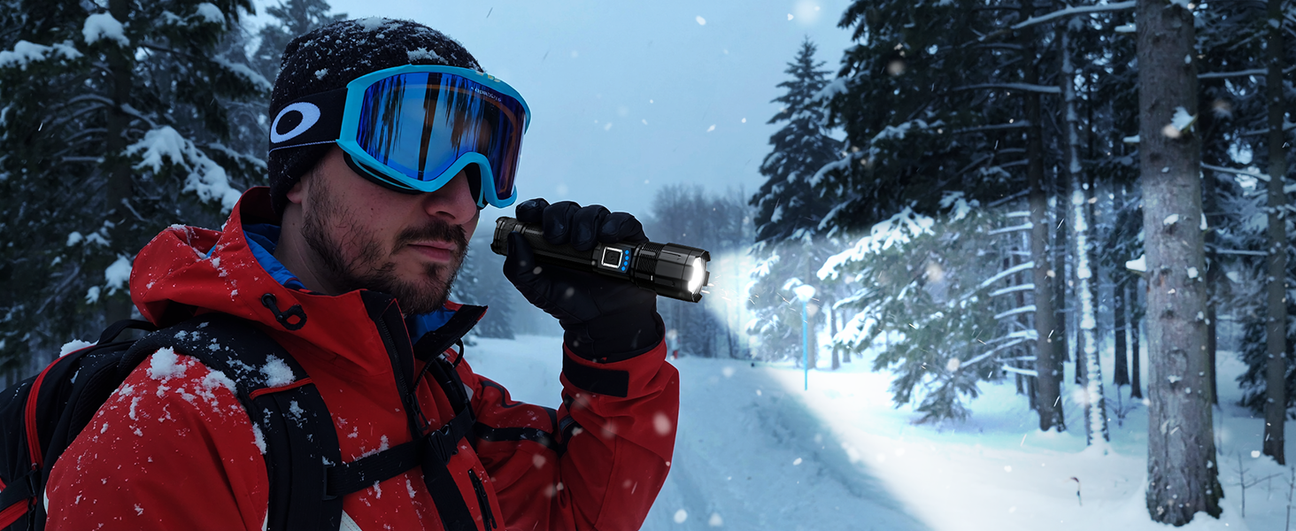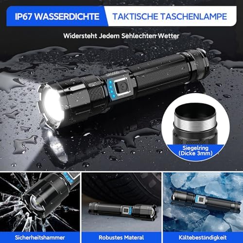 Mit der IP67-Zertifizierung ist die Taschenlampe nicht nur wasserdicht, sondern auch schnee- und staubdicht. Die integrierte, versiegelte Gummidichtung sorgt dafür, dass selbst schlechtes Wetter kein Problem darstellt. Sie ist der ideale Begleiter für Nachtwanderungen, Camping und andere Outdoor-Abenteuer.