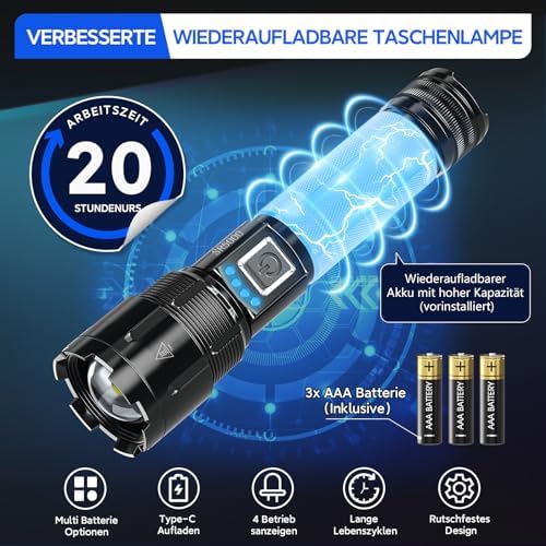 Mit 5 verschiedenen Lichtmodi – Hoch, Mittel, Niedrig, Strobe und SOS – passt sich die Taschenlampe flexibel Ihren Anforderungen an. Die Zoom-Funktion ermöglicht es Ihnen, zwischen breitem Flutlicht und fokussiertem Spotlight zu wechseln, sodass Sie bei Nacht immer die perfekte Beleuchtung zur Hand haben.