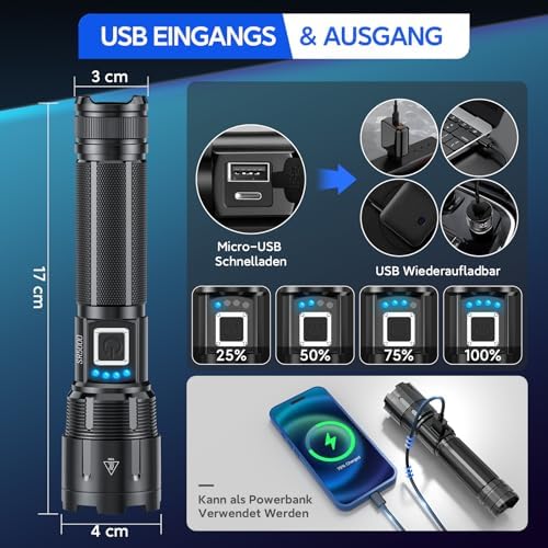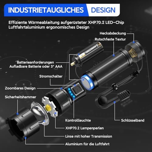Dank des hochmodernen XHP70.2-LED-Chips mit einer maximalen Helligkeit von bis zu 1.000.000 Lumen ist diese Taschenlampe in der Lage, selbst die dunkelsten Umgebungen zu erhellen. Ob dichte Wälder oder neblige Nächte – der Lichtstrahl durchdringt problemlos, sodass Sie eine Fläche von 300 m² vollständig ausleuchten oder Objekte in einer Entfernung von bis zu 1000 Metern erkennen können.