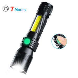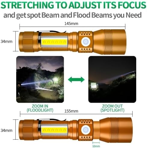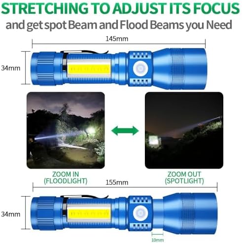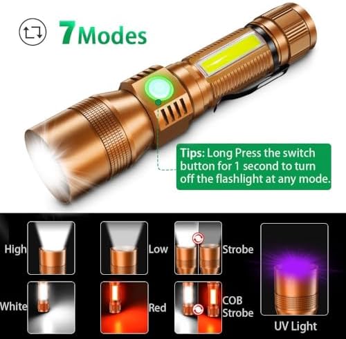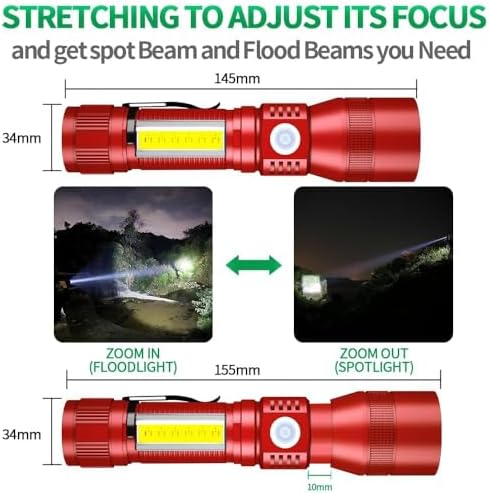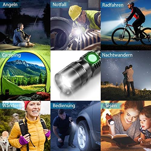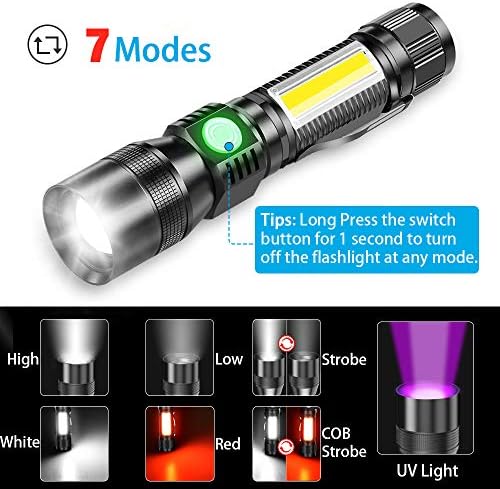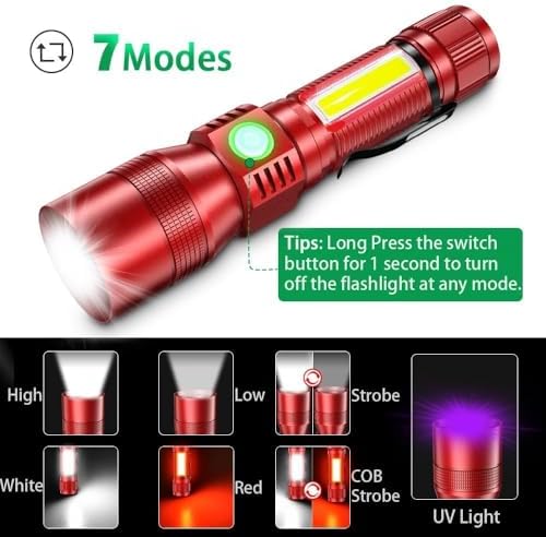 Mit 7 verschiedenen Modi – von intensivem weißen Licht über UV-Licht bis hin zu roten SOS-Lichtern – passt sich die Taschenlampe Ihren Bedürfnissen an. Sie können die Lichtstärke durch Dehnen des Gehäuses anpassen, um eine große Fläche oder gezielte Objekte auszuleuchten. Ob bei der Campingausrüstung, während des Wanderns oder beim Nachtangeln, diese Taschenlampe bietet immer die passende Beleuchtung.