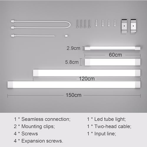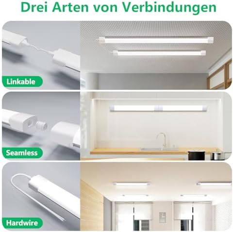 Die Lieferung umfasst eine komplette Ausstattung, die eine problemlose Installation garantiert. Im Lieferumfang enthalten sind unter anderem eine 50cm Eingangsleitung, ein 120cm Verbindungskabel, Montageklemmen sowie Schrauben und Dübel. Damit können Sie die Leuchte ohne großen Aufwand anbringen und sofort in Betrieb nehmen.