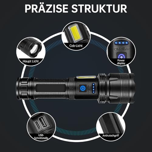 Die ZEUSFIRE Taschenlampe überzeugt mit einer beeindruckenden maximalen Leistung von 100.000 Lumen. Diese außergewöhnliche Helligkeit sorgt für ein konstantes, flimmerfreies Licht, das ein angenehmes visuelles Erlebnis ermöglicht. Egal ob beim Campen, im Haushalt oder bei nächtlichen Aktivitäten – diese Taschenlampe ist der ideale Begleiter.