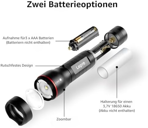 Ein weiteres Highlight der LE2000 ist die flexible Betriebsart. Sie können die Taschenlampe entweder mit 3 AAA-Batterien oder einer 3.7V 18650-Batterie betreiben (Batterien nicht im Lieferumfang enthalten). Dies bietet Ihnen die Freiheit, zwischen unterschiedlichen Stromquellen zu wählen, sodass Sie immer für verschiedene Situationen gerüstet sind.