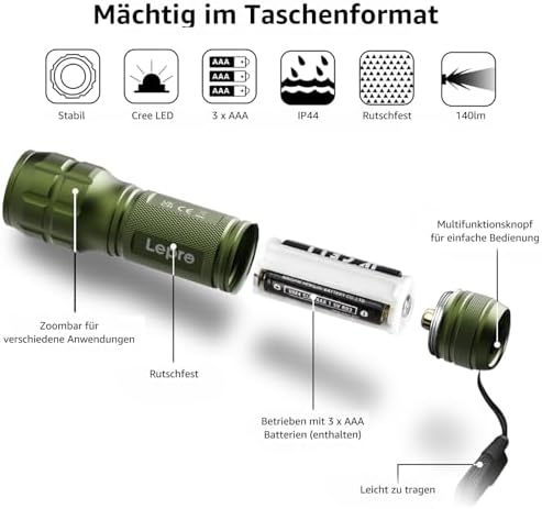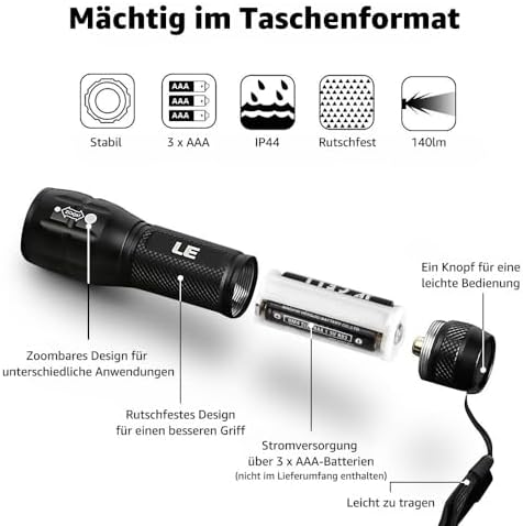 Diese handliche Lampe ermöglicht es Ihnen, entweder ein helles Flutlicht oder einen präzisen, fokussierten Spot zu erzeugen. Die gleitende Zoomfunktion ist unkompliziert und bietet Ihnen die nötige Flexibilität. Zudem sind die Batterien sicher und auslaufsicher. Trotz der kleinen Größe bietet die LE1000 eine lange Lebensdauer, die Ihren alltäglichen Bedarf abdeckt.