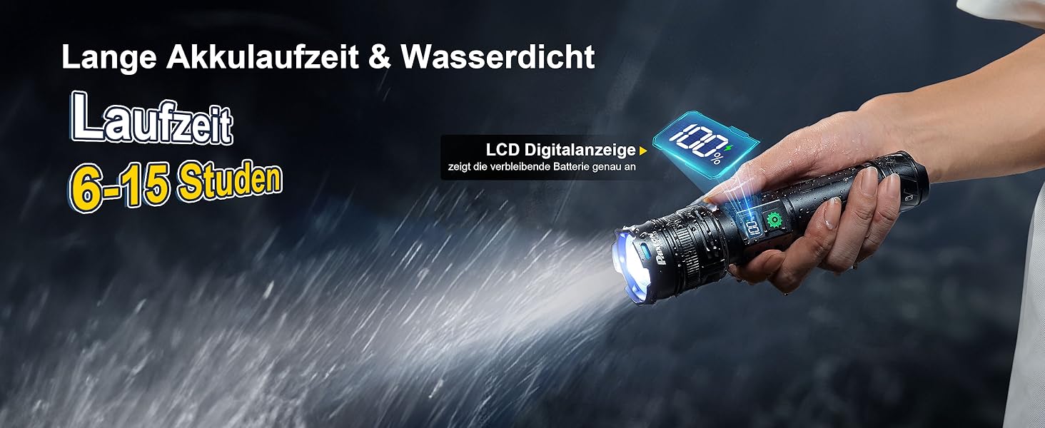 Ausgestattet mit einer leistungsstarken 6000mAh Batterie, sorgt die PH2403 für bis zu 10 Stunden starke Helligkeit. Das integrierte LCD-Display zeigt Ihnen präzise den verbleibenden Ladezustand an. Dank des intelligenten Chips ist die Lampe mit einem Überladungsschutz ausgestattet, der zusätzliche Sicherheit gewährleistet und die Lebensdauer der Batterie verlängert.