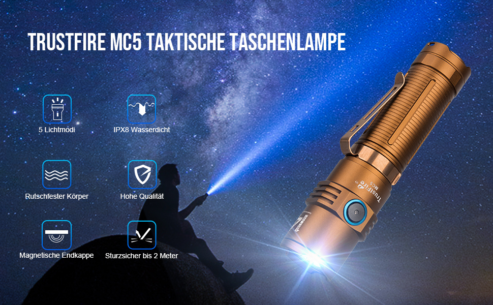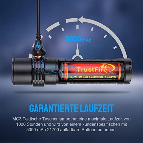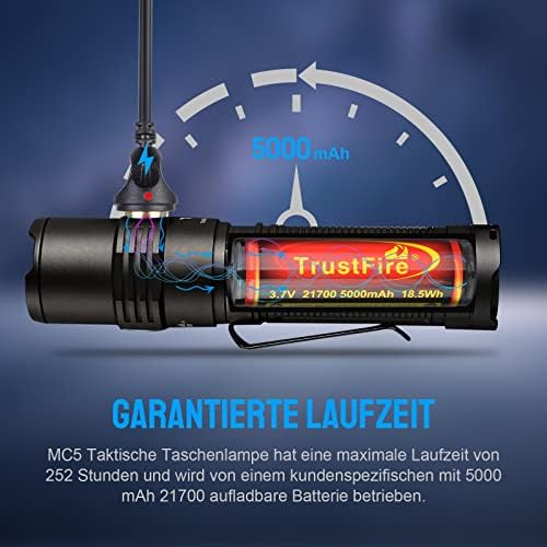 Erleben Sie die Sicherheit und Effizienz, die die Trustfire MC5 Taschenlampe Ihnen bietet. Egal, ob im Alltag oder im Abenteuer – mit dieser Taschenlampe sind Sie bestens gerüstet!