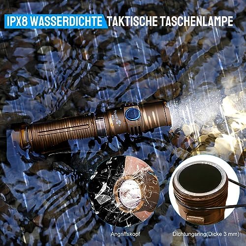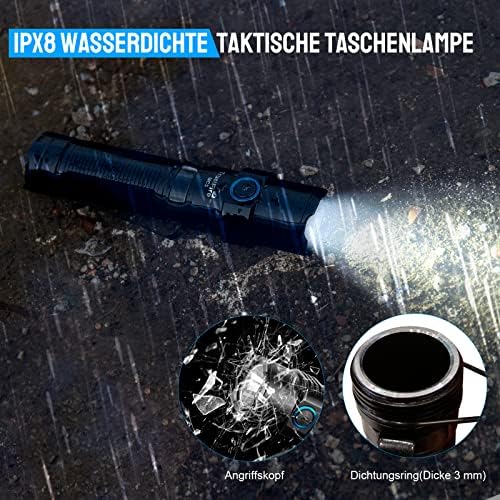 Die Trustfire MC5 ist nach IPX8 wasserdicht und hält extremen Bedingungen stand. Sie kann bis zu 2 Meter tief unter Wasser getaucht werden und übersteht Stürze aus bis zu 2 Metern Höhe. Ob Regen, Schnee oder unerwartete Stürme – diese Taschenlampe ist Ihr zuverlässiger Begleiter, egal welche Herausforderungen die Natur bereithält.