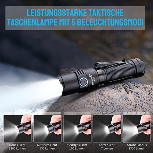 Die Trustfire MC5 Taschenlampe beeindruckt mit einer maximalen Helligkeit von 3300 Lumen und einer Reichweite von bis zu 362 Metern. Diese leistungsstarke LED-Technologie sorgt dafür, dass Sie auch in dunklen Umgebungen beste Sicht haben, sei es beim Campen, Wandern oder in Notfällen.